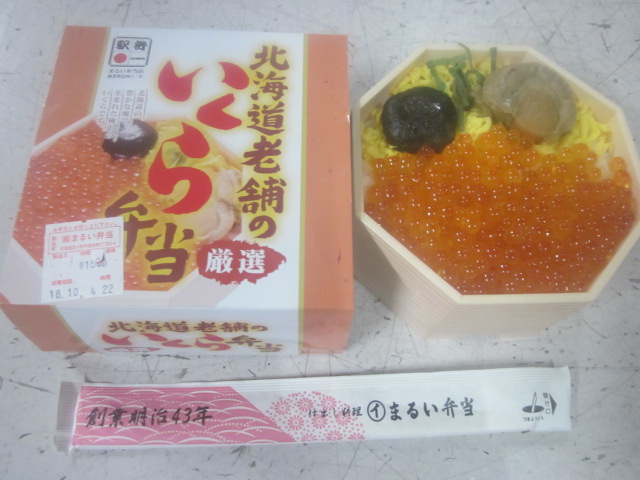 因みに、ここで購入したのは、一つ1500円もするいくら弁当。このお弁当店では、サーモン寿司やほっき弁当は何度か買ったことがあったのですが、流石にこの高価格帯のお弁当を購入するのは初めてでした。しかし、食べてみてびっくり、流石、看板商品がサーモン寿司でもある、”鮭の駅弁店”だけあって、このいくら弁当は絶品の美味しさで、プリプリのいくらがふんだんに盛られていて、たまの贅沢には良い一品だと思います。実際、お店の方と少しお話ししましたが、彼女の一番のお気に入りがこちらのいくら弁当だそうで、値段が高いので、いつも最後まで売れ残るのがこの商品だけど、私はこれが一番好き、と、リップトークではない(?)、本心からのお話の様子だったので、ちょっと買う時には値段に抵抗がありましたが、買ってみて良かったと思いました。