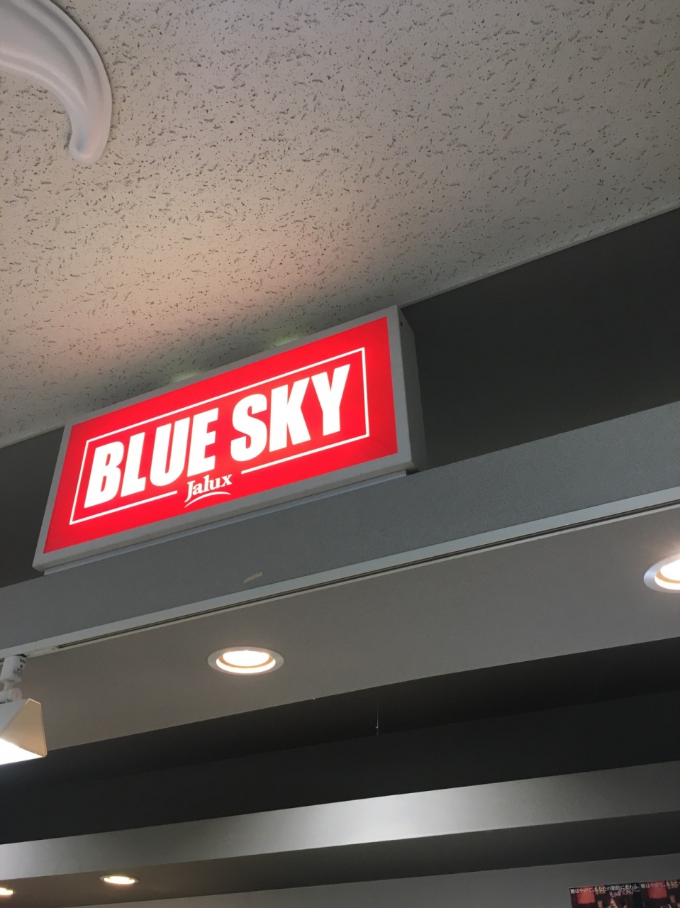 出雲空港の保安検査場を通過したら右手の突き当たりにあるのがBLUESKY。出雲蕎麦を始めとして軽食が食べられるし、ちょっとしたお買い物も出来る。丸いテーブルと椅子も用意されているので、よくある立ってということにはならない。