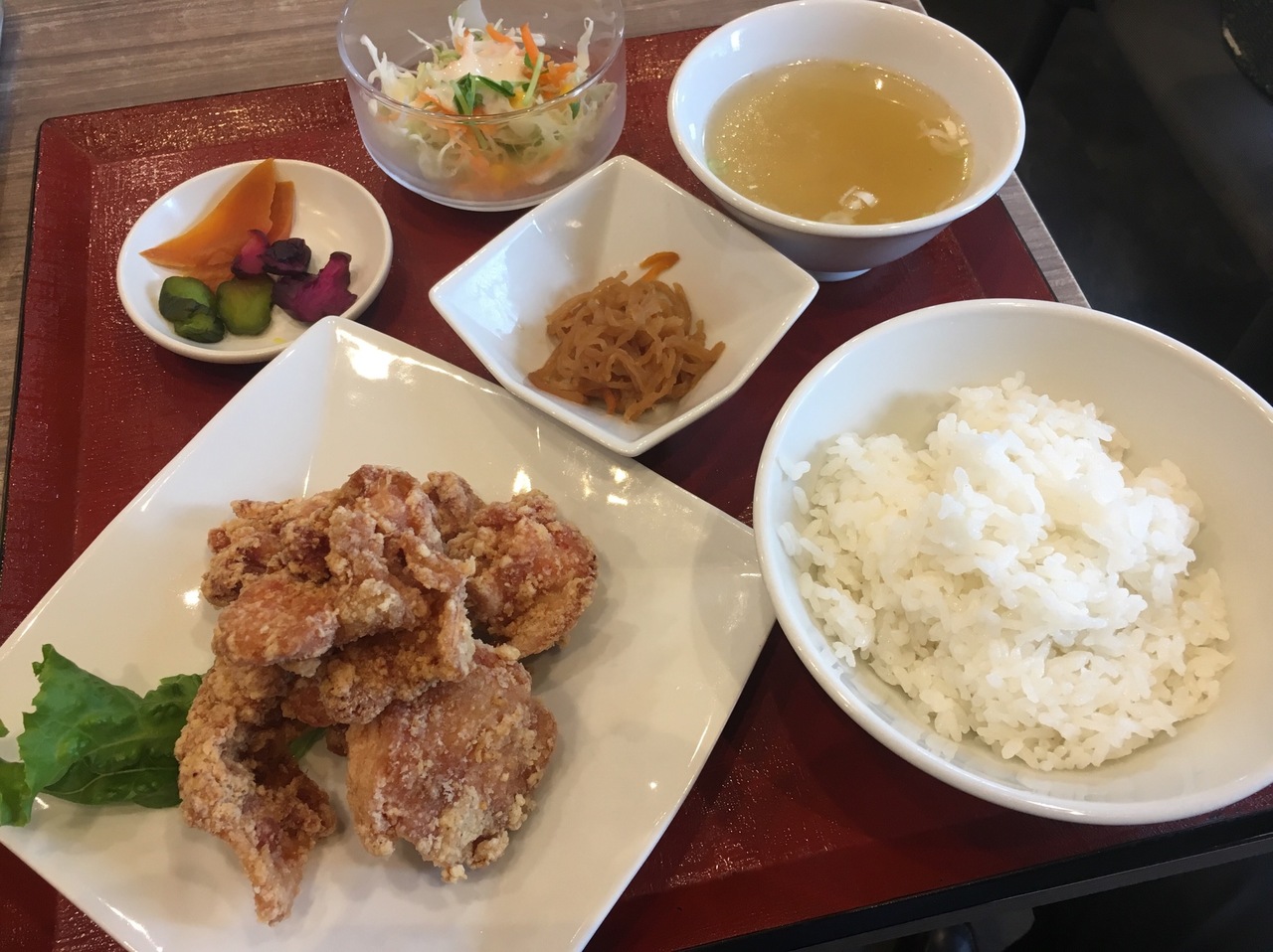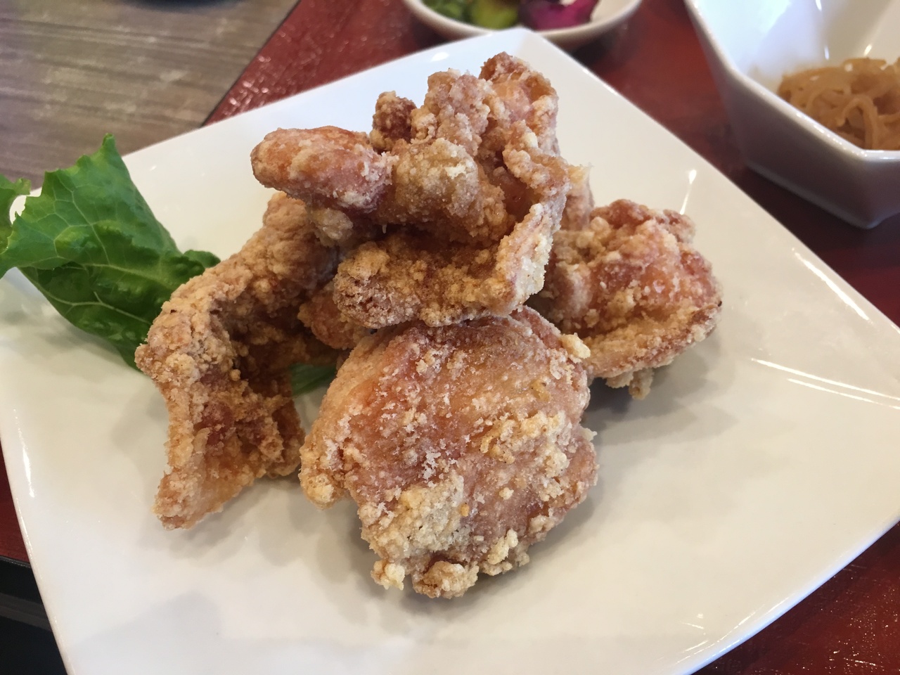 小麦粉をまぶして揚げた唐揚げは中はジューシーで美味しくいただきました。