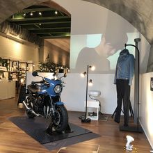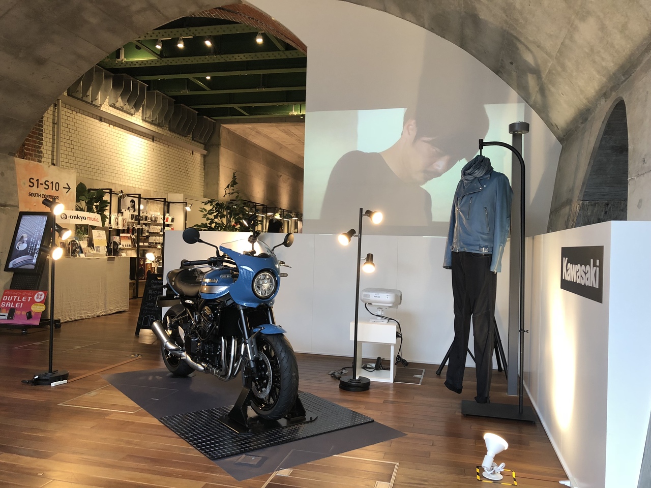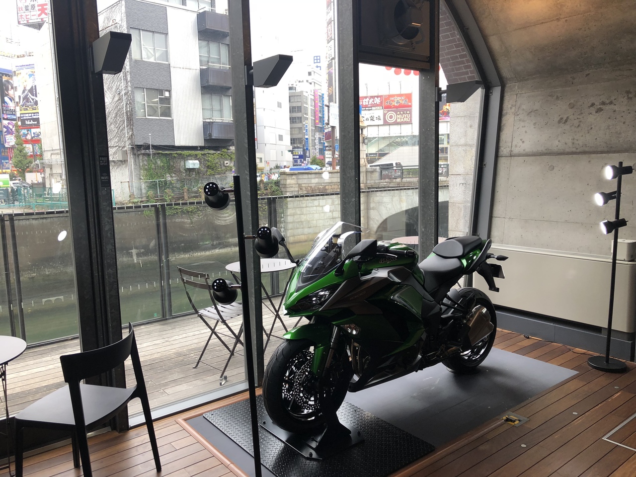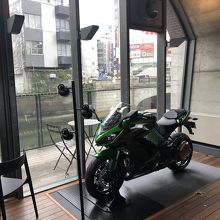とても雰囲気の良い商業施設で、概観も素敵です。中に進むと川側の万世橋の見えるところにバイクのカワサキショールームありました。