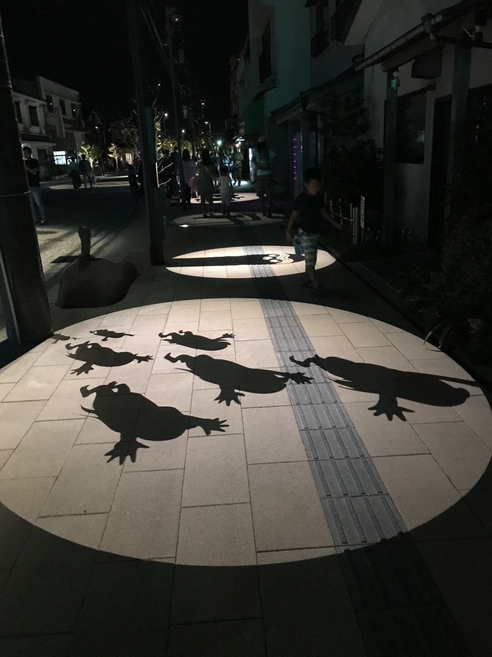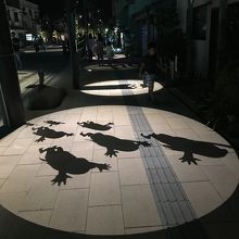 道いっぱいに沢山の妖怪達が影絵として映っており、またそれが消えたり点灯したりする様子が面白かったです。妖怪達のブロンズ像も、昼間の様子とはまた違い、今にも動き出しそうな雰囲気でした。ライトアップだけでなく、妖怪達が出てきそうな音響がどこからか流れてきて、それが一層楽しいです。