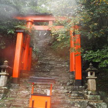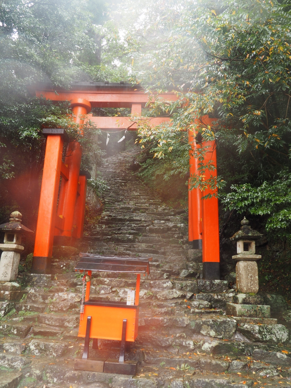 熊野三社を巡る旅で、お参りしました。住宅地の奥に神社の鳥居があり、そこから壁のような圧迫感のある石段を登ります。きれいに整備された石段では無いため、一歩一歩足元をみながら登らないといけません。