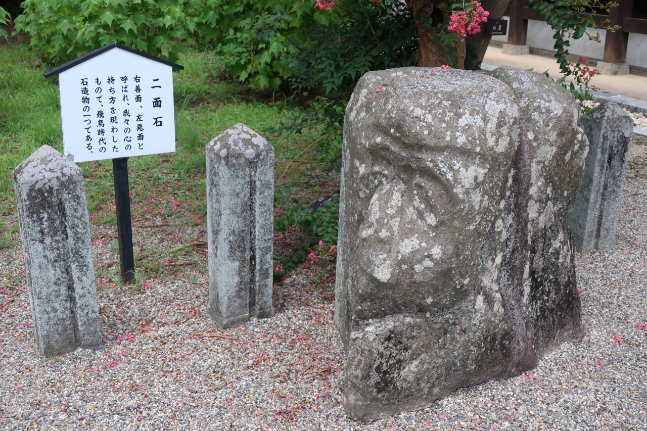 橘寺本堂に南側に置かれている飛鳥を代表する奇石の一つが二面石です。右側に善面、左側に悪面を持ち、その表情がどことなく面白いです。昔の人は良いセンスをしてると思います。