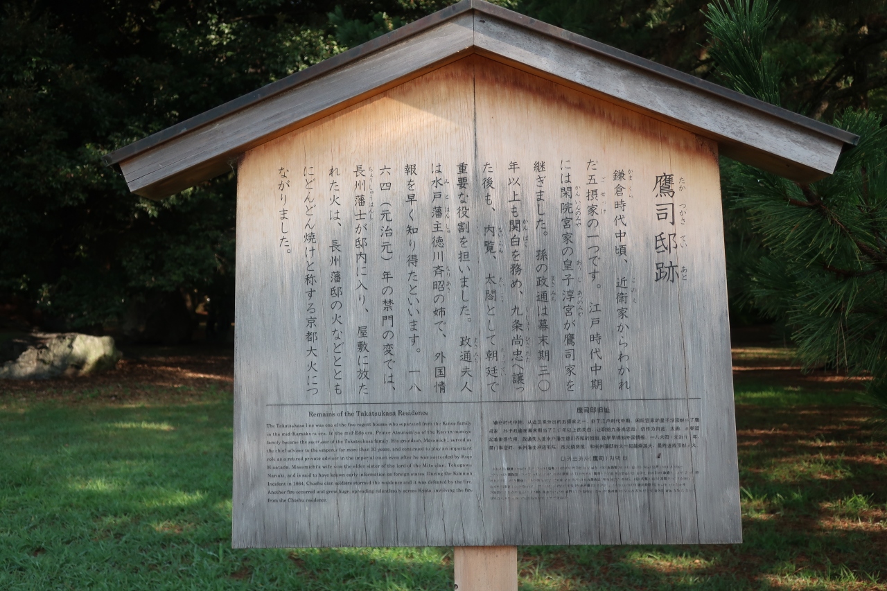 京都御苑を丸太町通りから堺町御門を潜って入った突き当たりの緑地帯が鷹司邸のあった所です。九条家とならぶ五摂家の一つで、禁門の変のときは長州閥の拠点となっていた場所である。そのため、この地が長州の久坂玄瑞が自害した場所でも知られています。現在の鷹司邸跡は木の植わるただの緑地となっており、説明版と碑が建っているだけで見ごたえはありません。ただ歴史の動いた場所として見る価値ありです。