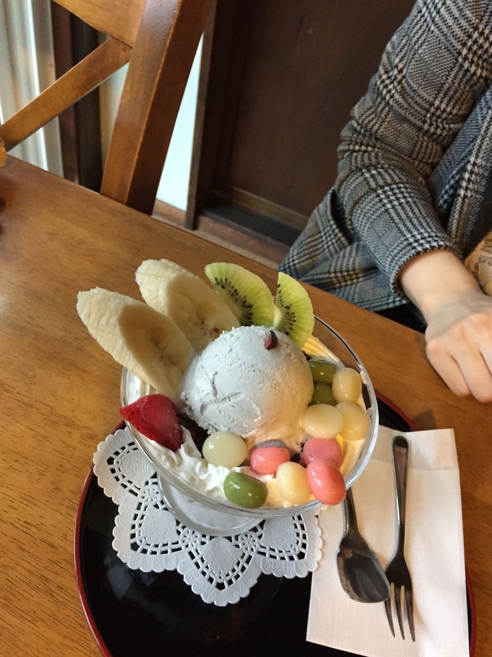 古民家の造りで中は座敷とテーブル席。奥には個室もあります。古いアンティークも飾られており雰囲気良いです。私はスイートポテトとゴマアイス、相方は定番のとうふ白玉パフェをいただきました。わたし的に一番美味しかったのはスイートポテトでしたよ。