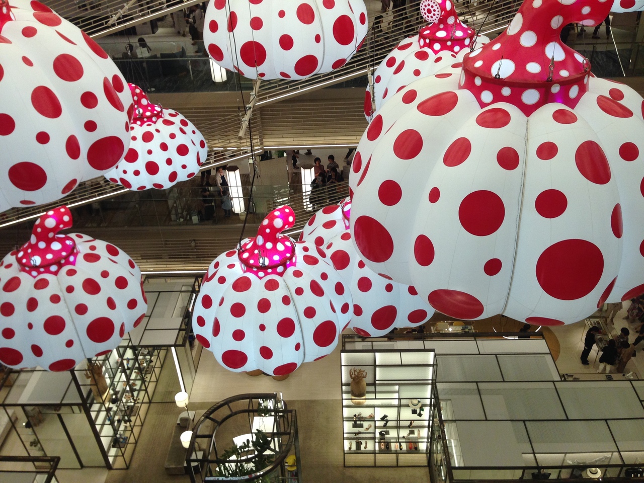 店内は吹き抜けで天井が高くとても開放感があります。私が行った時には草間彌生さんの水玉模様の作品が天井から吊るされていました。店内もハイセンスで洗練された商品が多く、商業施設というより美術展に来たような気分になります。