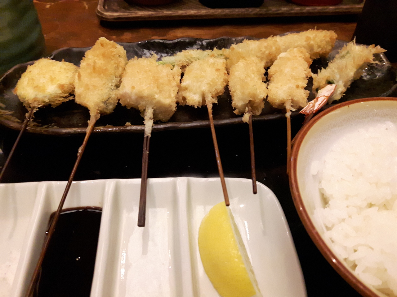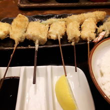 ランチタイムは、揚げたての串揚げランチが二種類。海老やアスパラなども入っていて、とてもお値打ちです。特選ランチは、キャベツやスティック野菜のお代わりもできます。レジも担当する店長の接客サービスが爽やかで、とても良かったです。