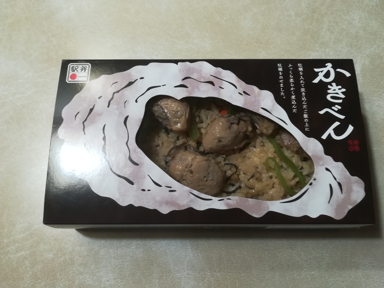 釧路駅構内の売店で「かきべん」を購入しました。醤油で煮た大粒の牡蠣が5個炊き込みご飯の上に山クラゲと一緒に乗っています。厚焼き玉子、芋の茎、酢漬け生姜の付け合わせ、薄味のご飯と牡蠣がよくあって美味しかったです。