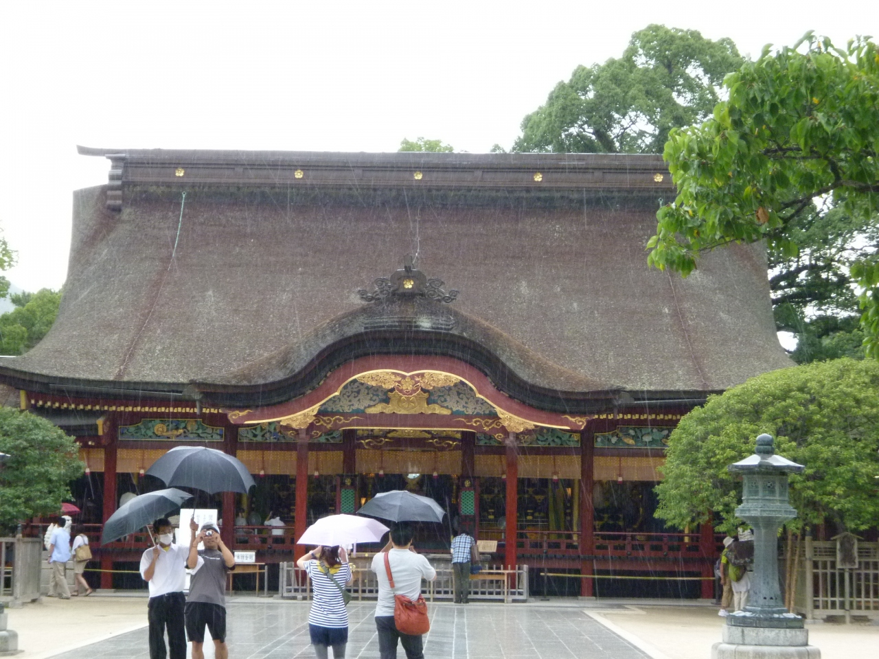 重要文化財で、右手に飛び梅、左手に大楠、参道は広く開放感と迫力と雰囲気を持った御本殿です。御祭神はもちろん菅原道真公、学問の神様で学業や合格祈願といったら太宰府天満宮とすぐ浮かぶくらいのところですね。もとは道真公の墓所だったそうで、本殿の正面の登竜門の彫刻は天神様が鯉にのって滝を登っています。