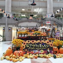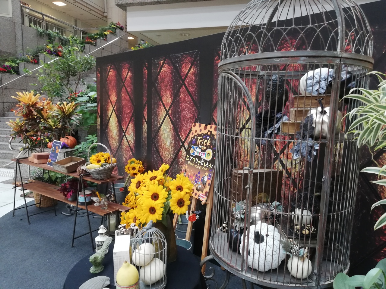 ハロウィンの飾り付けとヒマワリの組み合わせ。