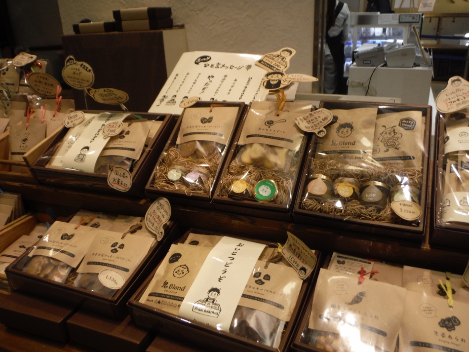 岡山駅2階のサンステの中にあります。さんすての中でも朝早くから営業している店舗の一つです。岡山の「おいしいコト」を集めたショップということで珈琲スタンドですが珈琲以外にもジャムやクッキーなども。洒落た岡山のお土産になると思います。鬼のイラストも味があって可愛いので喜ばれると思います。