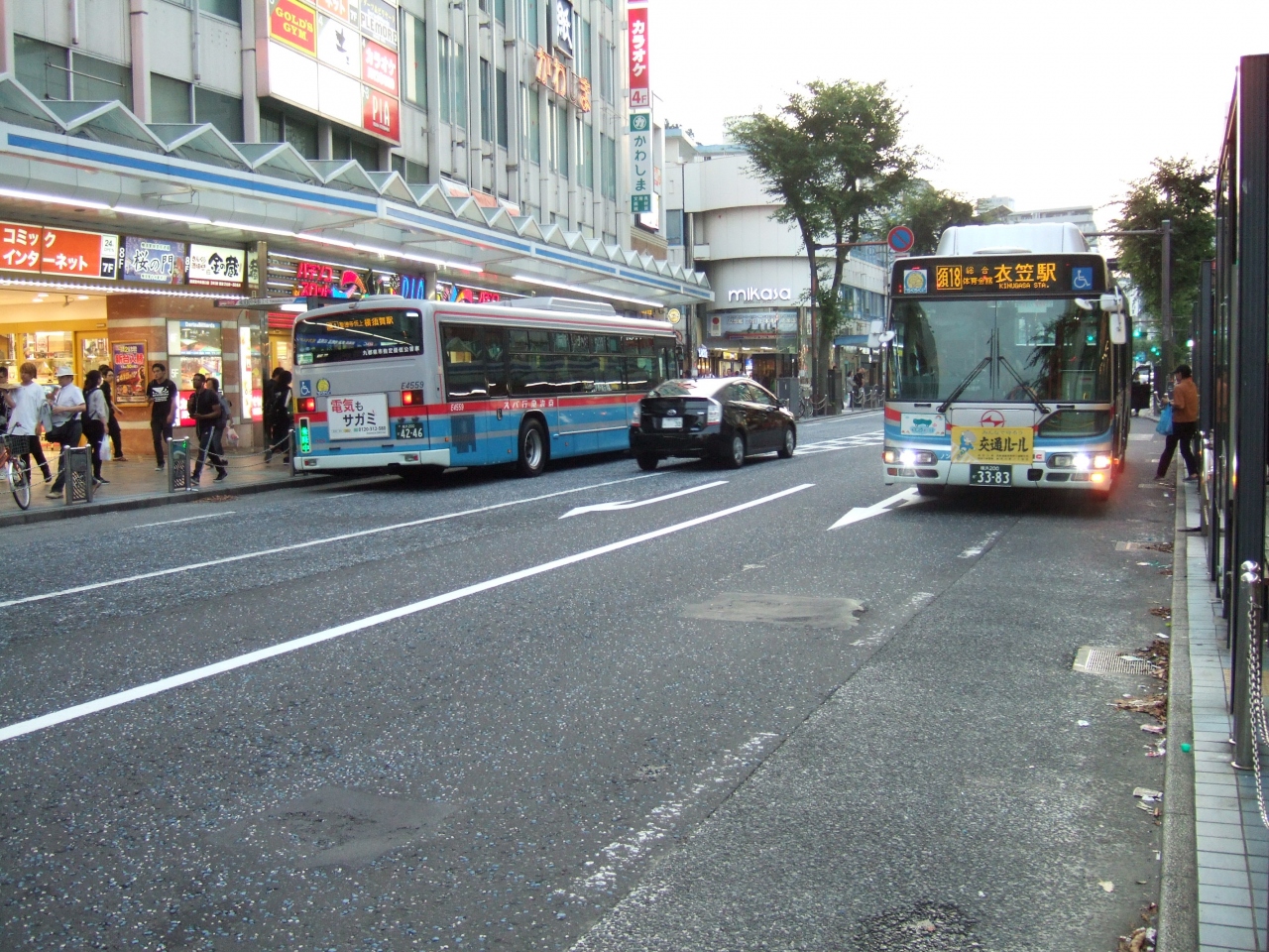 京浜急行の横須賀中央駅から横須賀線の衣笠駅へ向かうには、久里浜まで電車で行っても乗り換えで歩くので、京急バスが便利です。10分に1本くらいの便数があり、平坂を登って衣笠十字路から衣笠駅まで、20分くらいです。でも、ドル箱路線のようで、混んでいました。