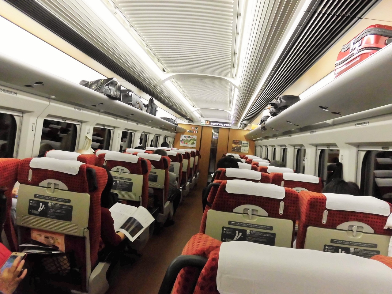 通路を挟んで左右とも2列ずつで、車両に入った瞬間は狭いのかな?と思いましたが、座席は足元もゆったりしており、落ち着いた雰囲気になれる空間でした。