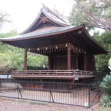 上野東照宮境内の石灯籠が並ぶ参道の右に建っている古い木造の神楽殿です。新しい木材が一部あり補修されていました。神社によっては雨戸を閉めて舞台が見えない神楽殿がありますが、ここは奥まで見ることができます。正面奥に木の扉が閉まっている小さめの舞台のようなものがあり、木枠に刀の絵が白く描かれているのが特徴です。美しい曲線の立派な刀の絵は力強いものでした。何故刀なのか分かりませんが、珍しいです。舞台の奥を見ることをおすすめします。