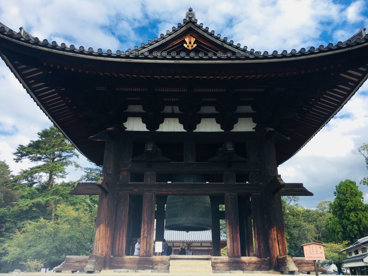 東大寺から二月堂へ上がる道の途中にありました。遠くから見ても鐘の大きさに驚いたのですが、中に入って真下から見てみると怖ろしくなる程でした。また、建物自体も国宝らしく趣があり、鐘を支える柱もとても立派なので、ぜひ近くで見てみる事をお勧めします。