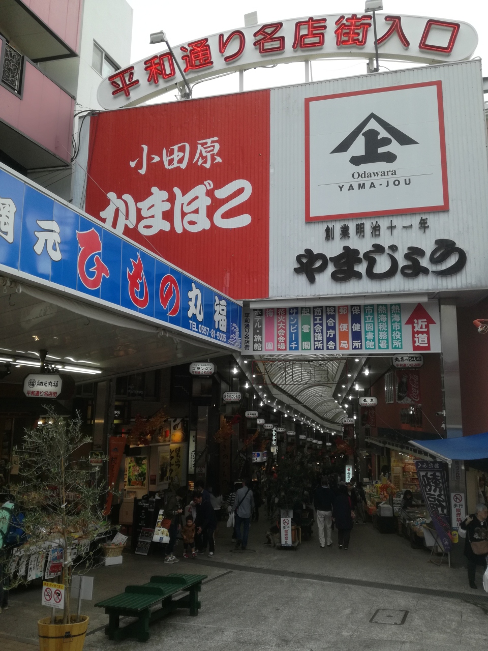 熱海駅を背にして右側線路沿いに伸びるアーケード商店街です。地方のシャッター商店街が多い中、観光地の駅前だからでしょうか、店舗がぎっしり連なっています。