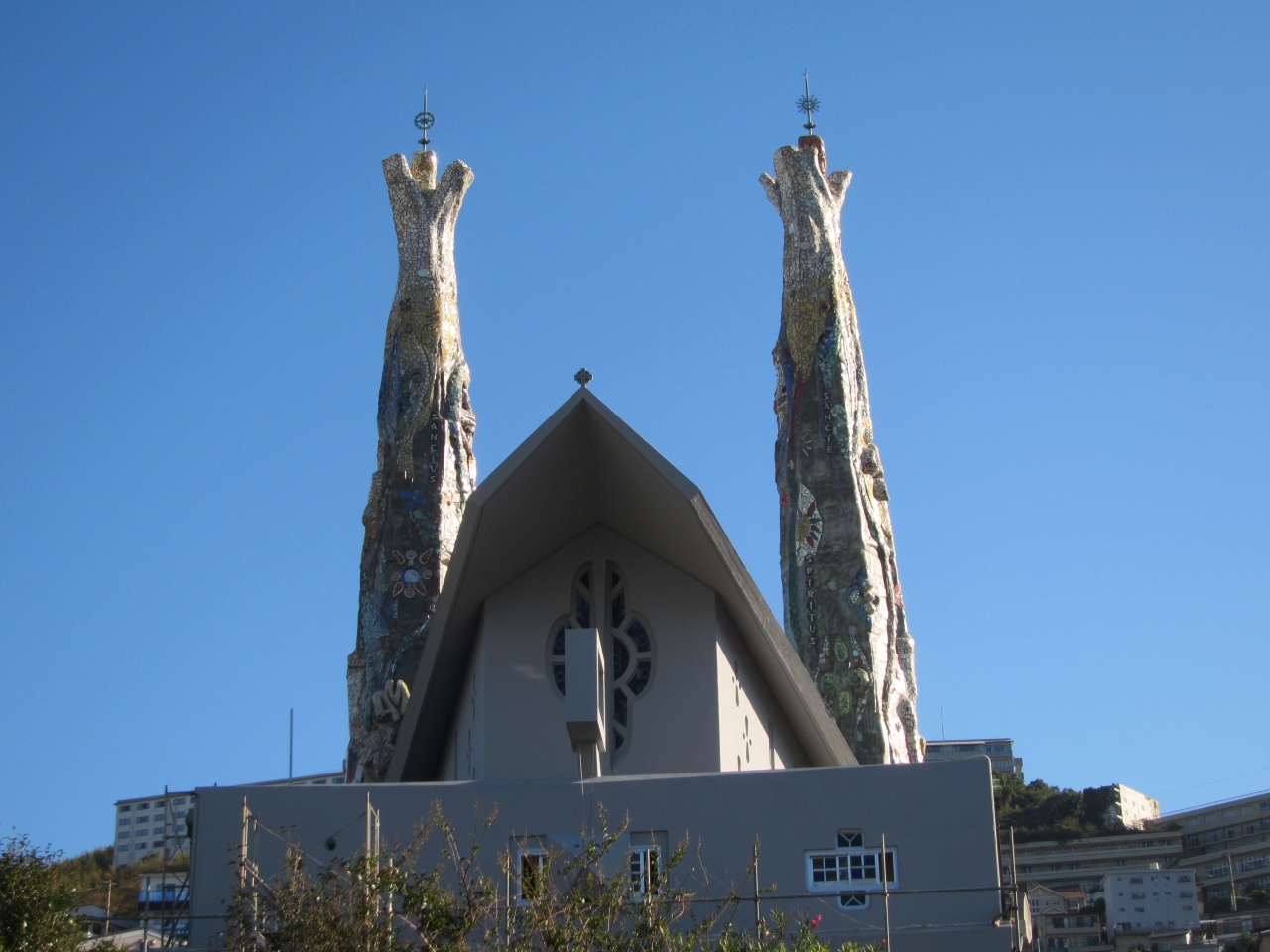 高くそびえる2つの塔には陶磁器が埋め込まれていて、芸術的的です。ガウディの建築のような雰囲気がしました。朝8時頃に行ったので誰もいなくて、静かな空間の中で見学することができました。祭壇の正面下に26の十字架のレリーフがありました