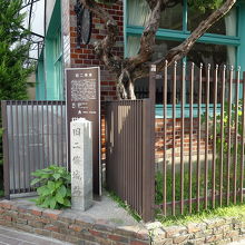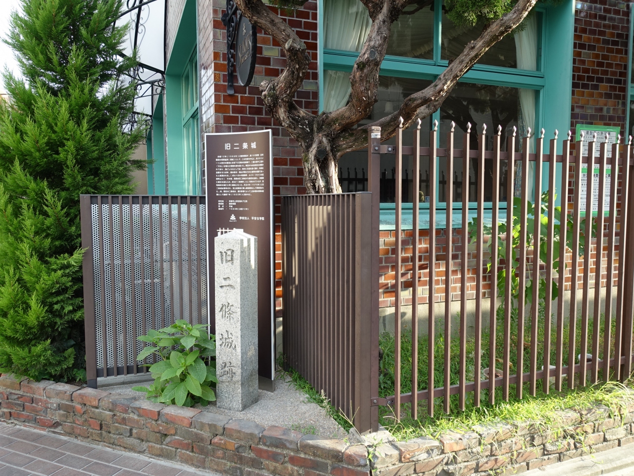 平安女学院の敷地の一角に「旧二条城跡」の石碑と案内板があります。1569年にこの近辺に、信長が足利義昭将軍の居城として、城を築いた場所とのこと。その城が「旧二条城」だと記してあります。