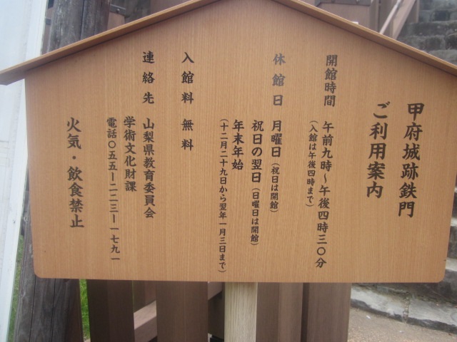 現在の甲府城跡エリアの中で、天守台のすぐ手前にあって、一番規模が大きくて写真映えする門建築がこちらだと思います。歴史史料等を基に、当時の姿に近い形で、忠実に再現された様子が解説板でも詳細に示されていて、歴史好きな方にはとても好感が持てる門ですし、ここが素晴らしいのは、脇道から登り口があって、内部見学できるようになっている点です。ただ、ここの見学口は結構早く(16時半)に閉まってしまいますので、遅い時間に訪問される方は、内部が見られなくなる可能性もありますので要注意です。