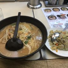 味噌ラーメンは具沢山の野菜炒めが乗っかっていて、麺のもちもち感との相性もいい。スープはこってりよりだがあっさり感も感じられる味噌スープ。素朴で旨いチャーハンのいいお供です。