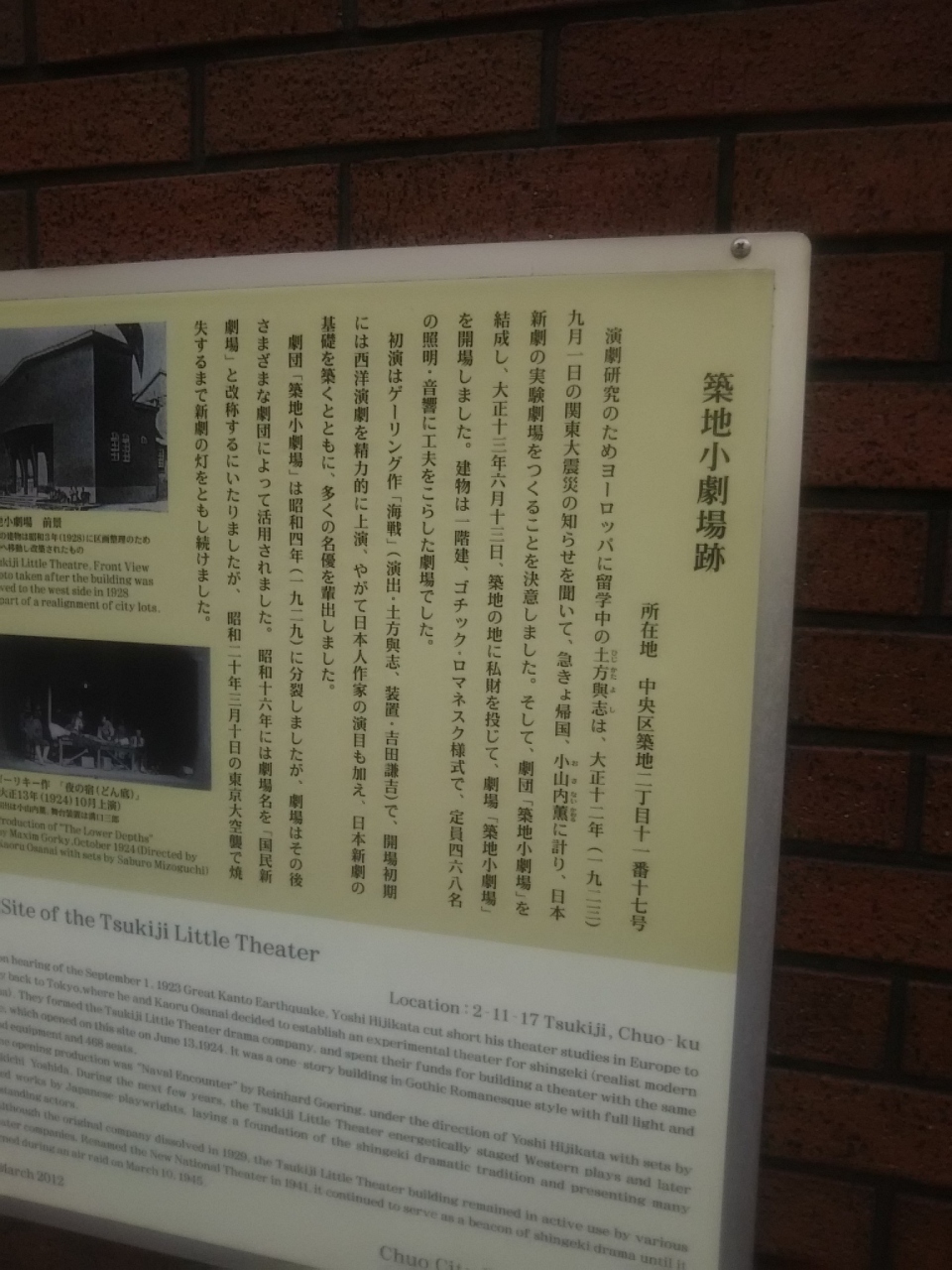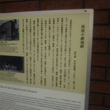 日本の近代の歴史において西洋の演劇の文化を発信するための劇場がこちらにできたそうです。 今の建物の現物はありませんがこちらの劇場の記念碑のところのプレートに当時の写真が残っているのでとても貴重な写真を見ることができました。関東大震災で焼失したそうです。通り沿いの壁に小さい記念碑がひっそりあります