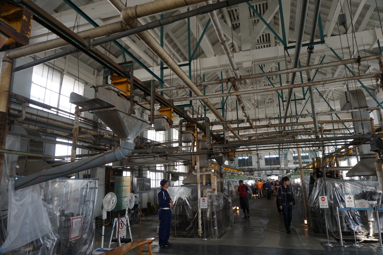 繰糸場は、富岡製糸場の心臓部。ここで繭から生糸を作っていました。天窓から自然光の差し込む明るい構内には隙間なく繰糸の器械がずらりと並んで壮観。ただ、大勢の工女が働いていたんだと思いますが、器械だらけで、どこにどう配置されていたのか。その姿は想像がつきにくいように思いました。