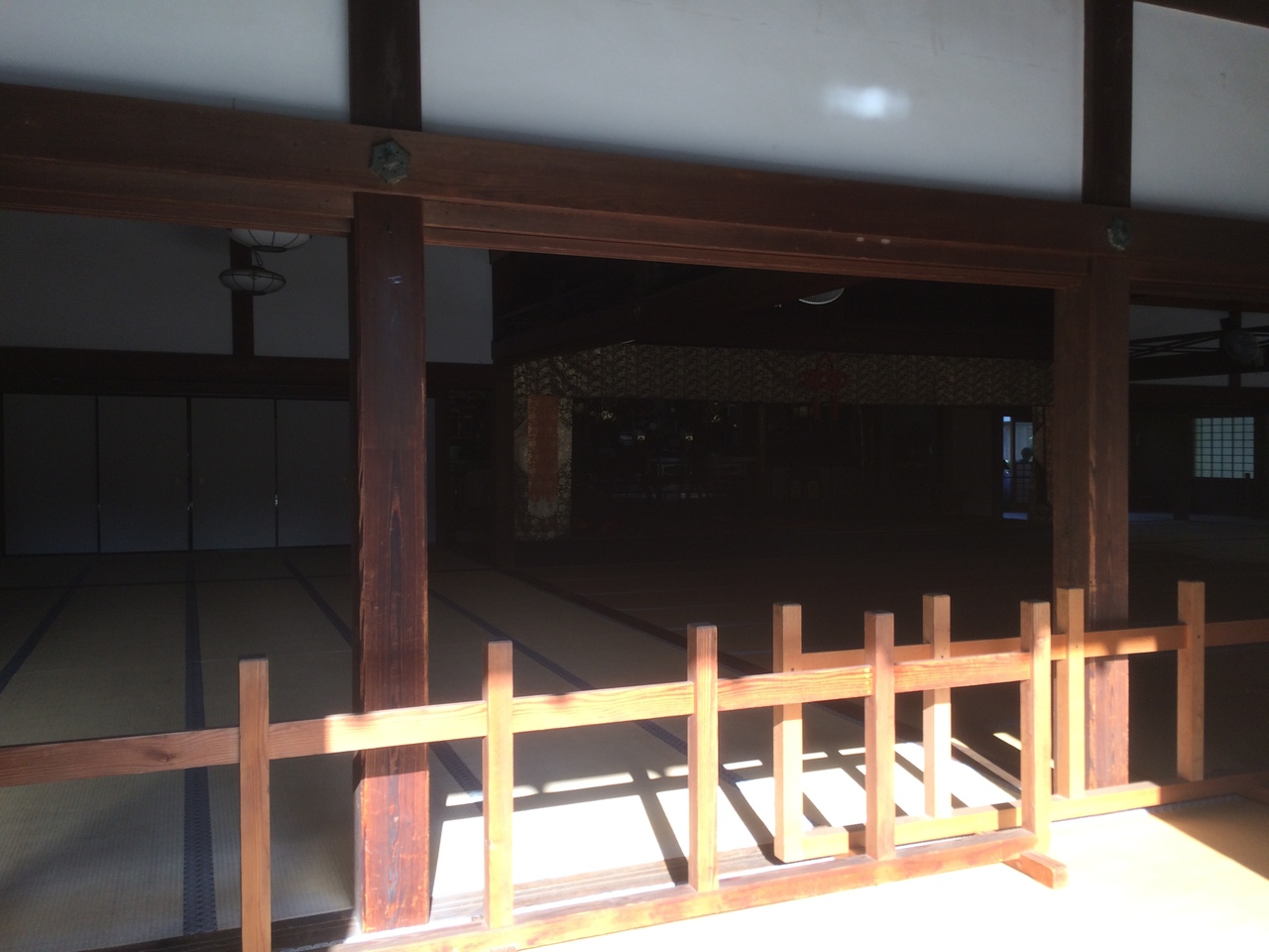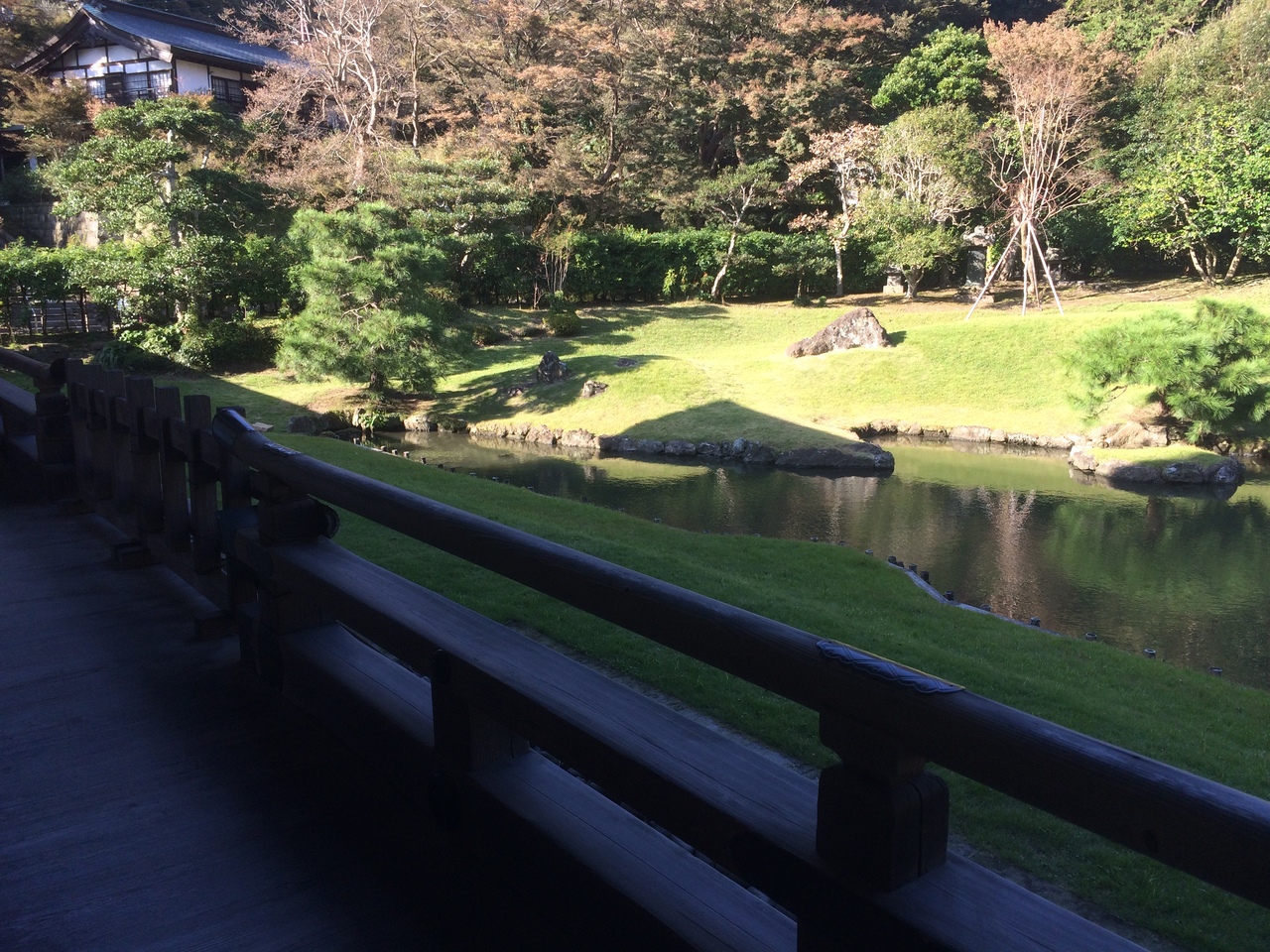 昭和15年に京都の寺から総門と併せて移築されたものです。靴を脱いで上がることができ、畳の部屋が広がっていました。裏側庭廻ると狭い廊下が外にあり、庭園を眺めることが出来ます。廊下は縁側のようになっていました。