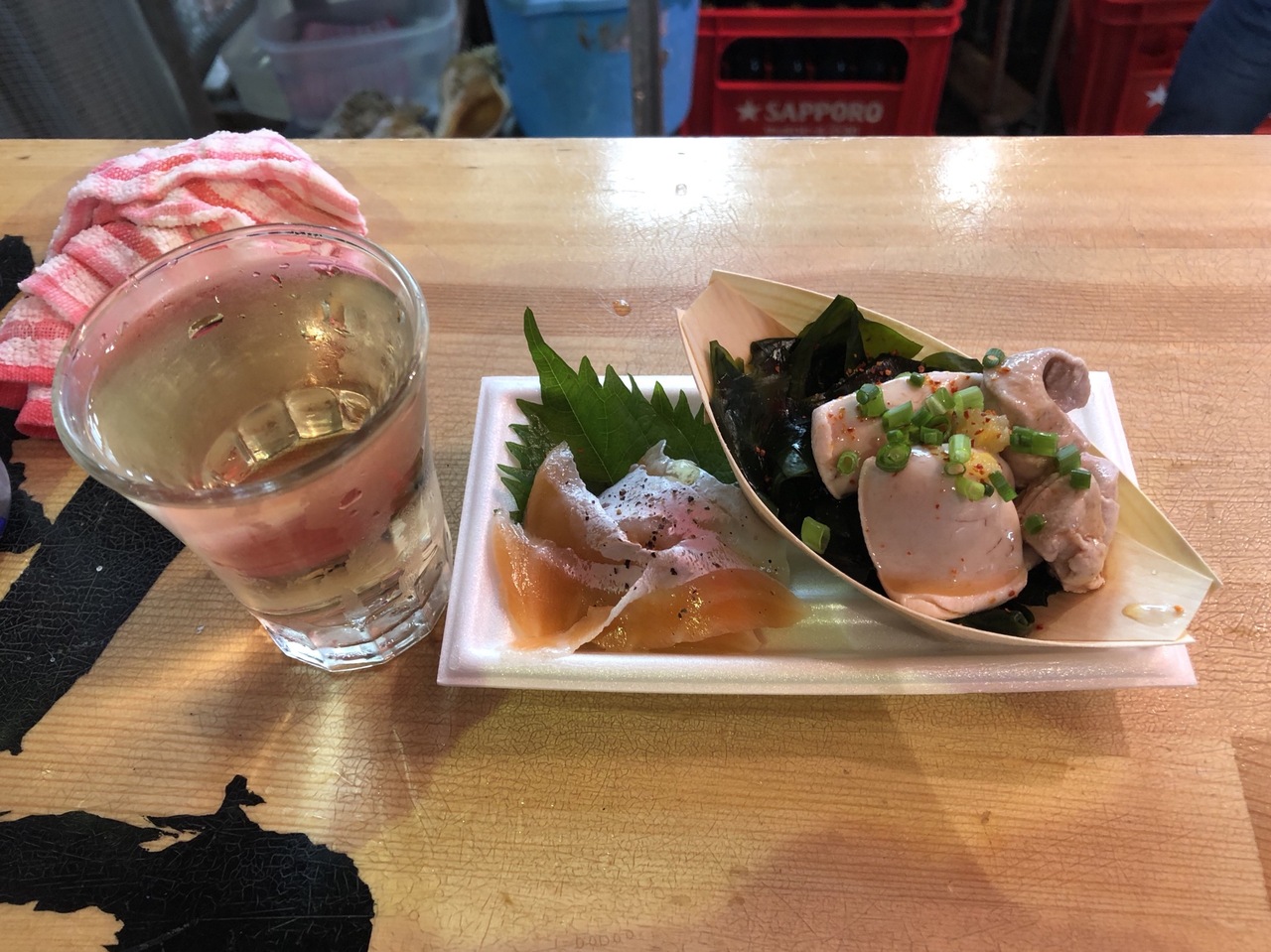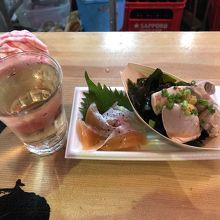 飲める魚屋さんと言いながら魚屋さんコーナーは見当たりません。スタッフさんオススメセット1000円をお願いしました。白ワイン+鮭の白子+酒の生ハムでした。ワインは詳しくないのでわかりませんがおつまみは最高。特に生ハムはまた食べたい。
