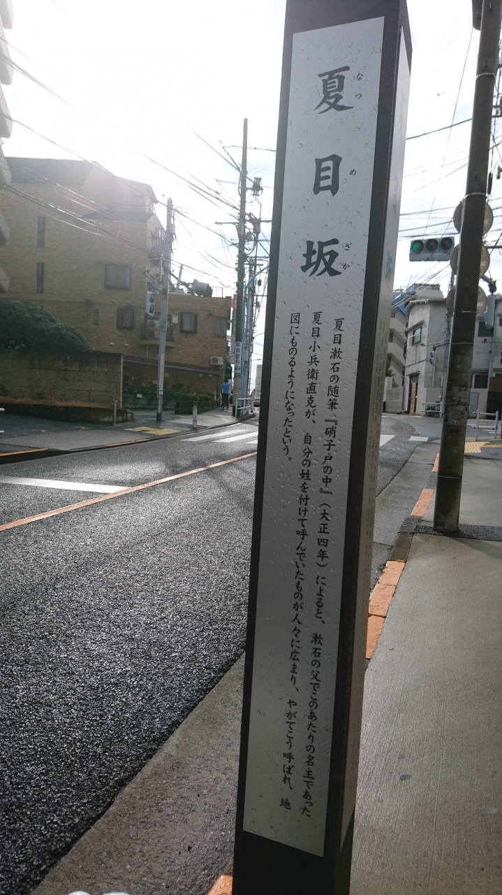 早稲田駅前交差点を坂下として南に緩やかに上っていく夏目坂を通りました。この辺りは、かつて夏目漱石の父親である夏目小兵衛直克が名主をしていたため、周囲の人達から夏目坂と呼ばれるようになったそうです。近くには漱石が晩年を過ごした漱石山房もあり、あちこちで夏目漱石の息吹を感じました。