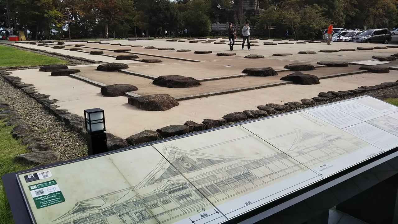 るーぷる仙台で行きましたが、かなり坂を上った高台にありました。鳥居をくぐって進むと急に開け、市街地が一望できました。かつて屋敷があったあたりには柱の跡が残り、当時の間取りを再現していました。伊達政宗像もありました。