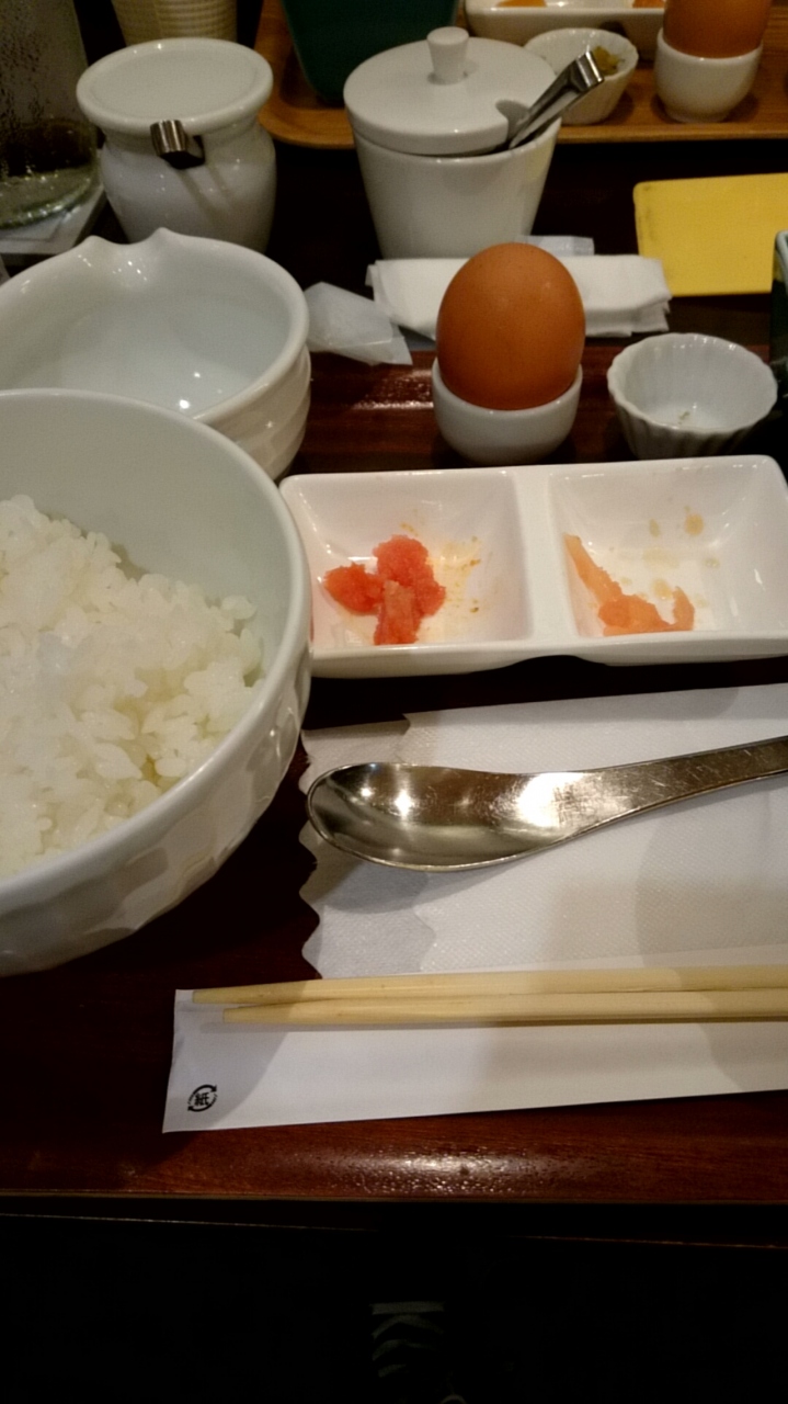 ご飯と味噌汁に小鉢、漬物、生たまごがあり