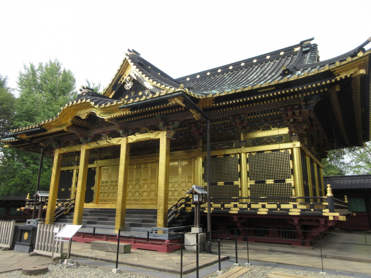 唐門や石灯籠、銅灯籠など見どころが多い上野東照宮の中でも、最大の見どころと言える建造物です。金箔をふんだんに使い、煌びやかに輝く豪華絢爛な建物です。外壁には江戸時代の職人の技術をふんだんに生かした彫刻も施されています。参道正面に建つ唐門の煌びやかさに満足し戻っていってしまう観光客がほとんどですが、ぜひ社殿を参拝し、目をみはるばかりの眩い豪華な社殿を見学してほしいと思いました。金色殿と言われる通りの建造物だと感じました。