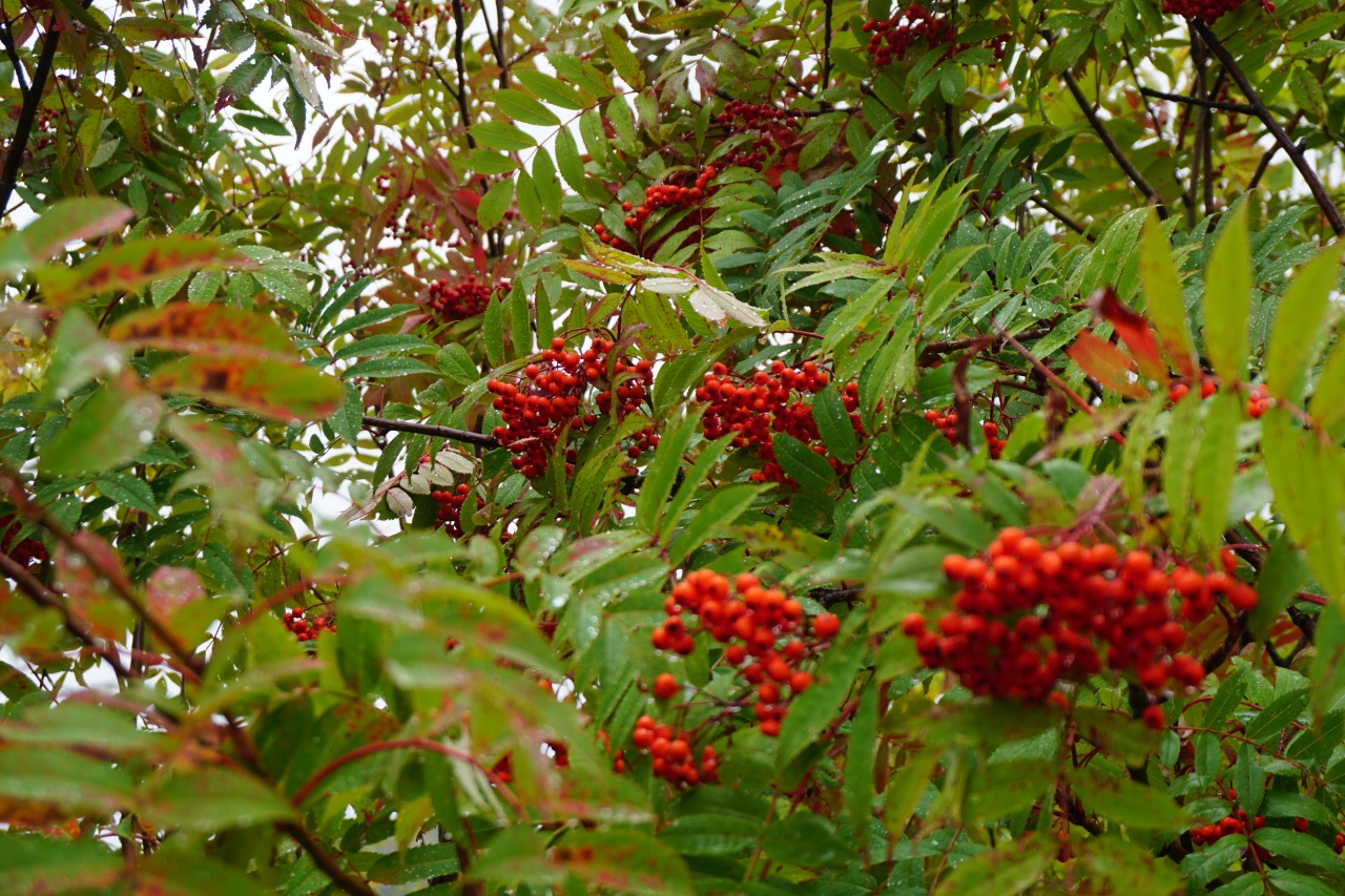 高山植物観察園は、黒部平駅を出て、裏手の方に回った先。一段低い場所に降りて、大観峰の方を見上げる一角です。ちょうどナナカマドが見事に色づいていましたが、実だけ赤いのや実も葉も赤いのやいろいろバリエーションがある。建物に近いと周囲の温度が高くなって違いが出るということもあるんだそうですが、いずれにしても、人間が種をまいたりして育てたもの。室堂や弥陀ヶ原ではそうした行為は一切行われていないので、ちょっと違和感を感じなくもないかな。ただ、植栽には変化もあるし見応えあり。意外に楽しめます。