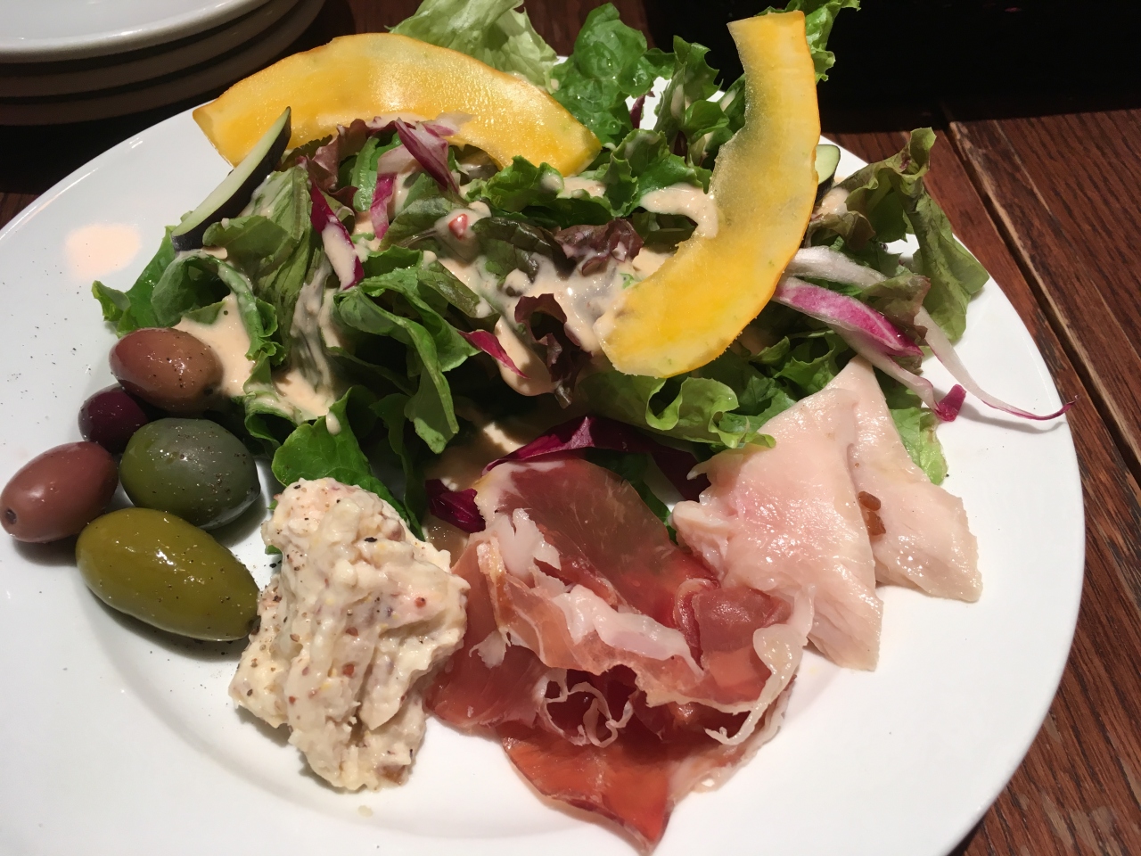 1,500円のランチコースを予約してあり、サラダ・前菜・メイン(パスタ数種類から選択)です。