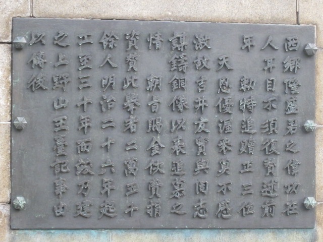この像に関しては、実物を見たことがない方でも存在は知っている位、ある意味日本一有名な銅像といっても過言ではないかと思います。上野公園内に数あるスポットの中でも、ここはまず第一に見ておくべき場所だと思いますが、私がこの像の素晴らしいと思う一番の点は、台座部分に設置されている漢文体の解説文で、これを見るだけでこの銅像の歴史をひしひしと感じることが出来ます。尚、漢文体なので、現代人には解読し辛い部分もあるかと思いますが、より詳細な現代文での解説板も隣に設置されていますので、観光客的にはこちらを読んで理解しておくと良いでしょう。