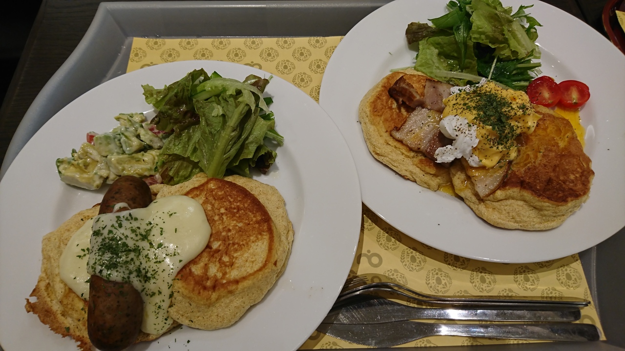映画を見る前の腹ごしらえ。甘くないパンケーキは初めてです。シフォンケーキのようなふわふわ感と、あっさりした味が、野菜やソーセージなどの盛り合わせにピッタリ合っています。なかなか美味しいです。次はやっぱり甘い方を食べたいケド。。