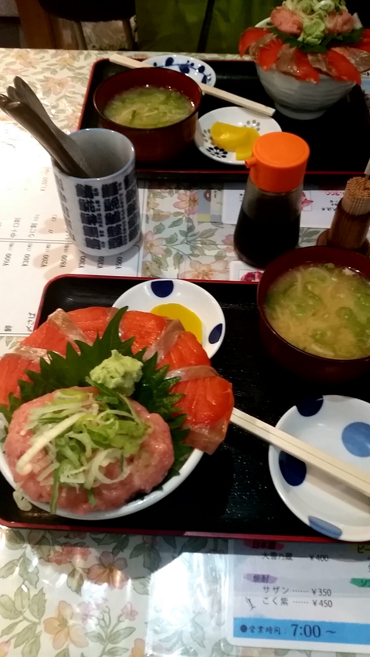 サーモンとねぎとろ丼を注文。まあ味はそんなものかって感じ。シャリはすし米なんで美味しかった。