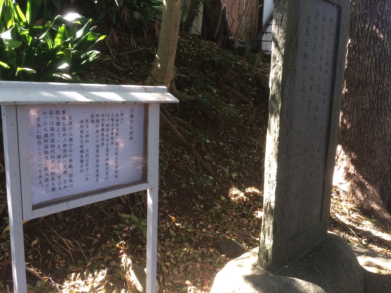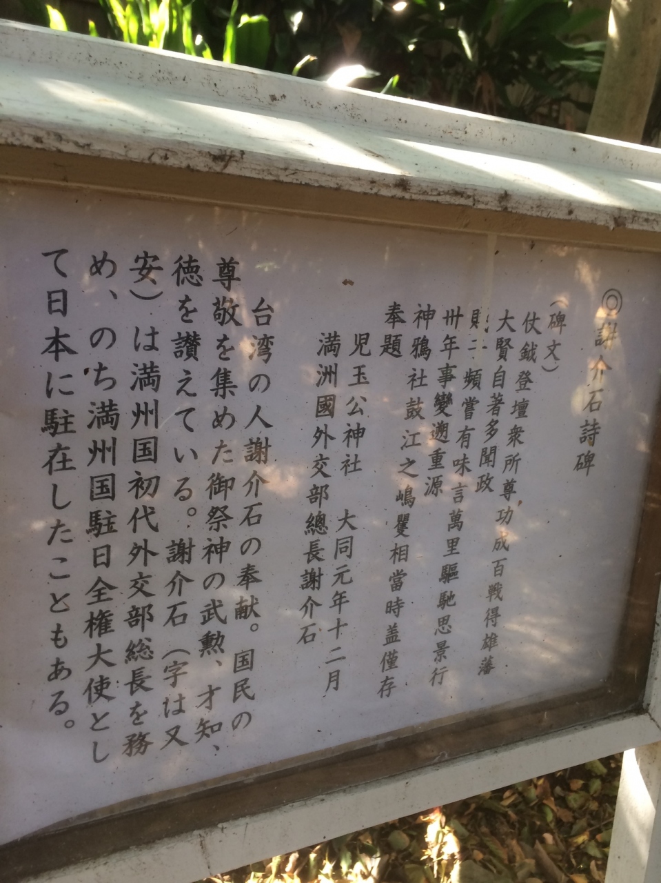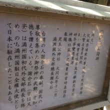 満州国全権大使として日本に駐在したこともあると記載がありました。その右側には碑文が書かれていましたが意味が分かりませんでした。賞状を入れるような額の上ような看板に文字が見え書かれて、横に石碑がありました。