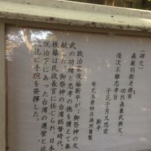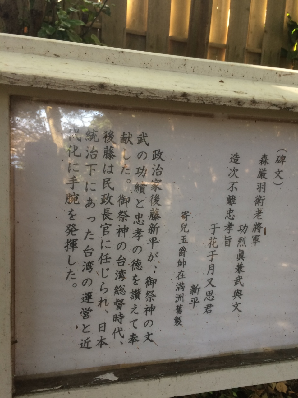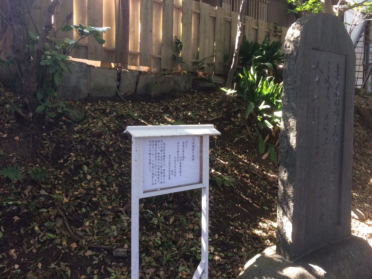 台湾の近代化に手腕を発揮した政治家で、同じような石碑が並んでいる場所に蒋介石の石碑もありました。鳥居を潜ると右側に同じ形の石碑と白い看板があります。見どころではないですが、いくつか同じものが並んでいるので思わず立ち止まる場所でした。