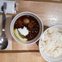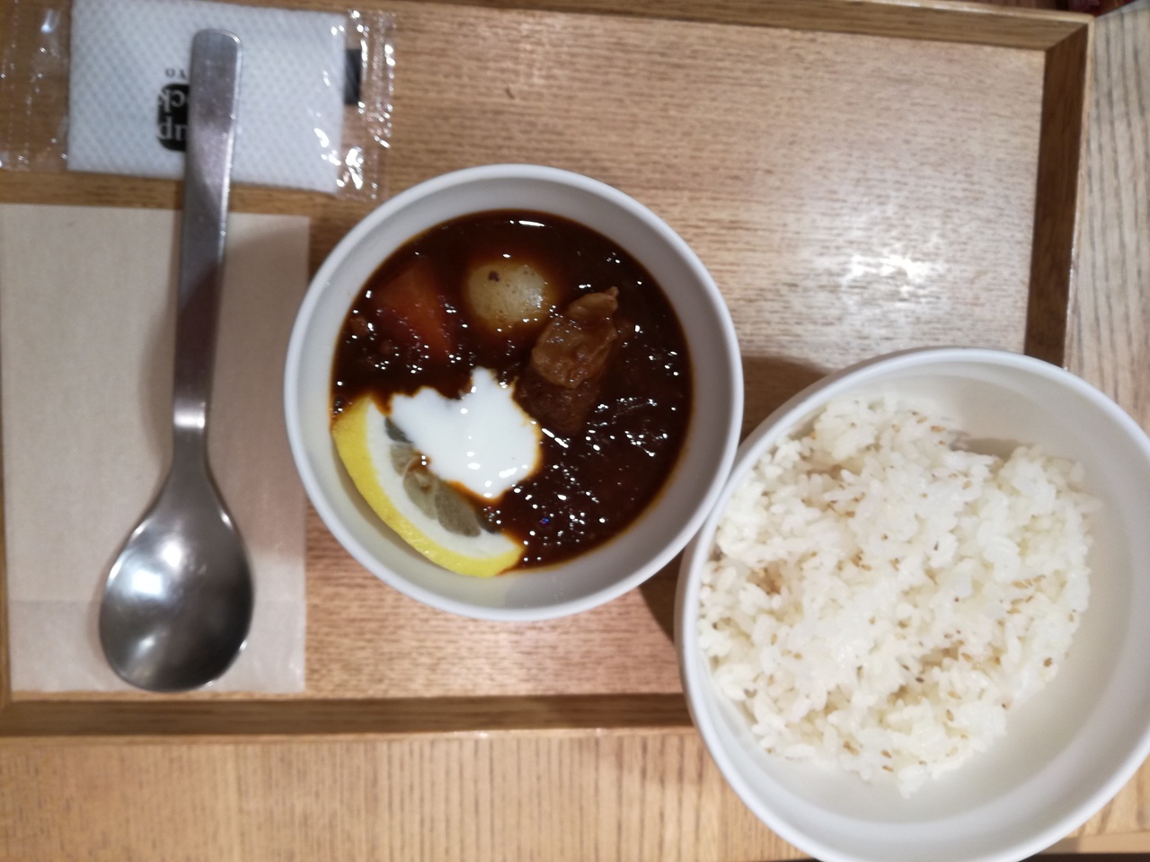 カウンターと2名がけの席が4つほどです。平日の11時頃だったので、店内は空いていました。新作のスープも試食させてもらいました。東京ボルシチとご飯のセットです。