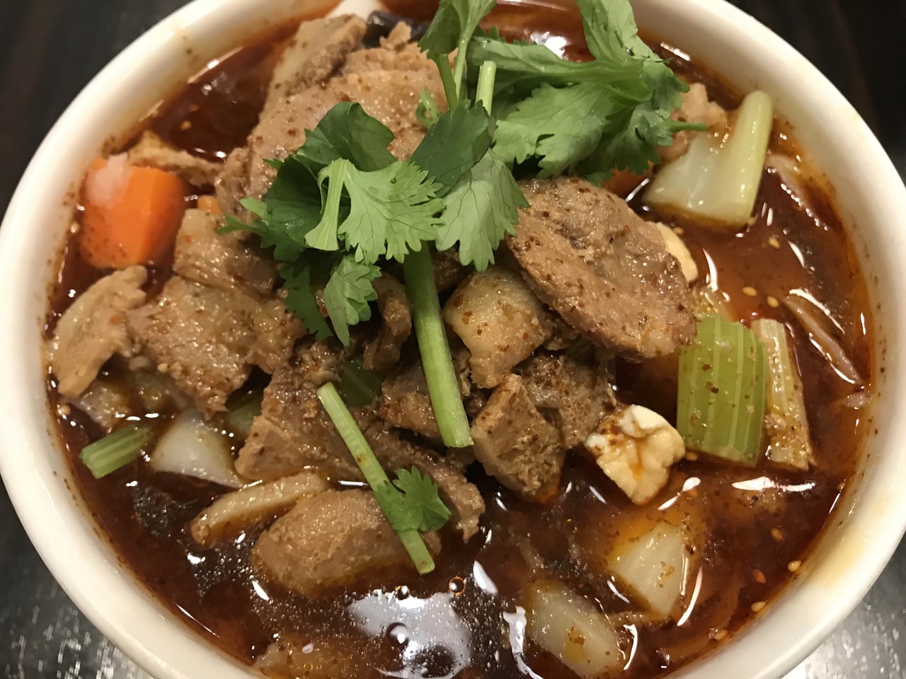 ピンナンの名物の岐山臊子麺を頂きました。酸辣湯のように酸味がありつつ、香辛料の効いた深みのある味で美味しかったです。麺は刀削麺でした。200円追加で大盛りにしましたが、量が多くて食べ切れませんでした。。