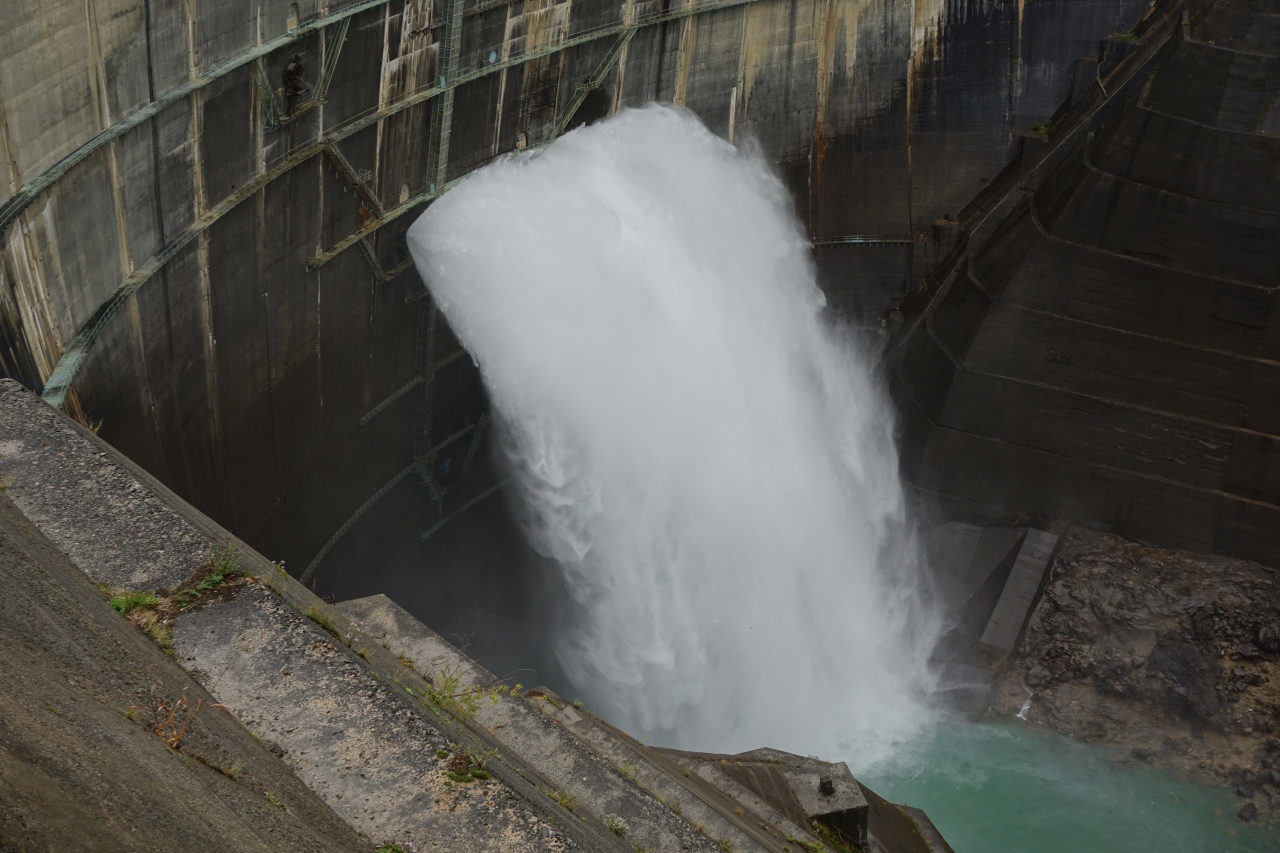 黒部ダム観光放水は、6月26日から10月15日までの期間。一年中やっているわけはないのですが、この期間は観光シーズンなので、普通に行けばいつでもやっているといったイメージだと思います。ごうごうと音を立てて大量の水が吹き出しています。ぼんやりしてみていると何んということはないですが、水の動きをしっかり追ってみるとスローモーションみたい。その迫力がよくわかるように思います。