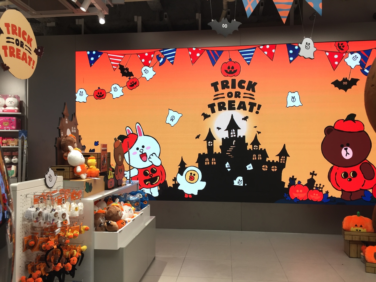 原宿の明治通りにあり、お店の前には写真を撮る人たちがたくさんいるので、すぐに分かりますよ。今はハロウィンのディスプレイが可愛らしくて 写真を撮る順番待ちが発生してました。ラインの可愛らしいキャラクター達のグッズがたくさんありました。