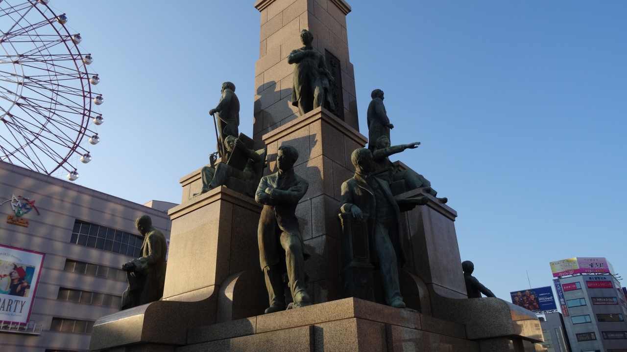 昭和56年に建立された銅像で、1865年の鎖国時代に藩命で薩摩からイギリスに留学した13歳から34歳の薩摩出身の19名が彫られています。
