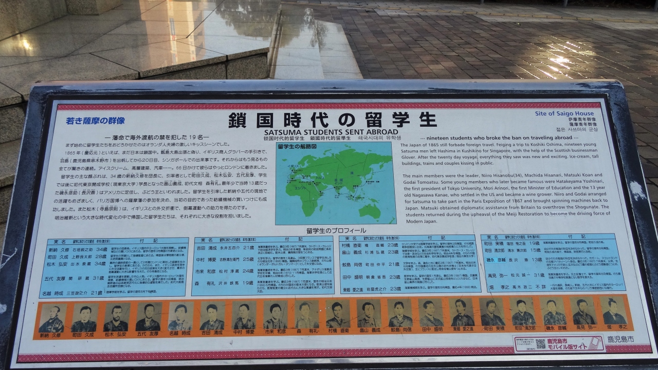 有名どころでは朝ドラで有名になった五代友厚をはじめ、初代文相の森有礼、東京大学(旧東京開成学校)の初代学長、東京国立大学の初代館長等がおり、その他の人達も欧米の大使になったりしているとのこと。西郷さんや篤姫だけでなく、薩摩からは明治維新の偉人が多く輩出されたんですね。