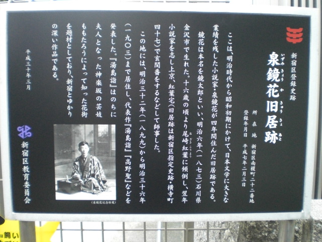 新宿区教育委員会の泉鏡花旧居跡に関する解説板が、南榎木町に立てられています。