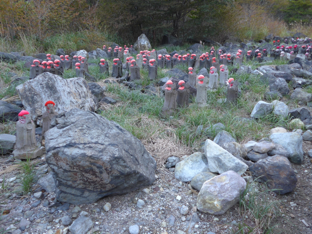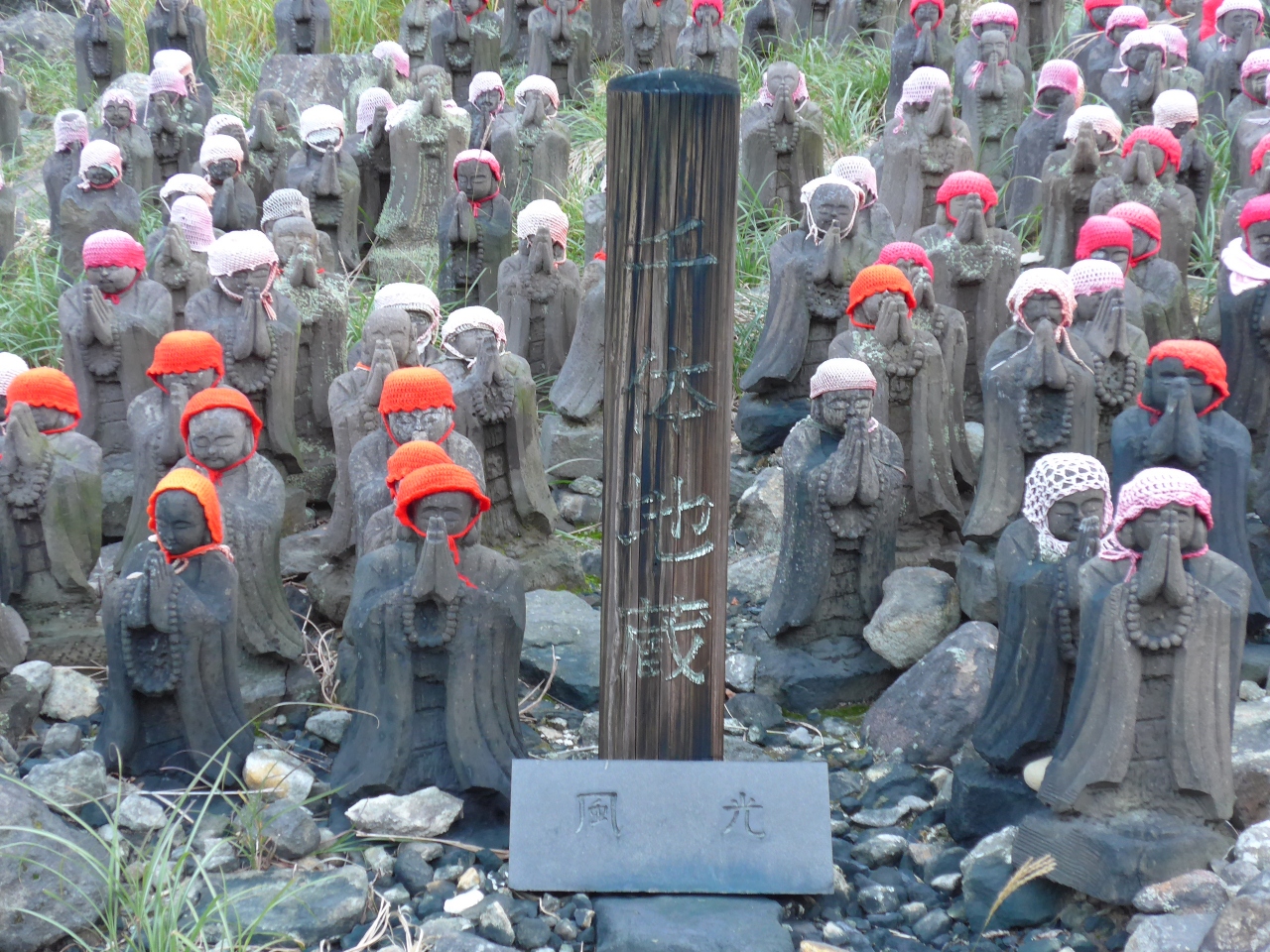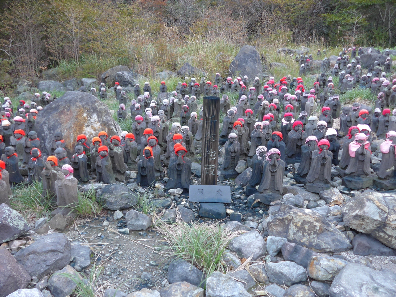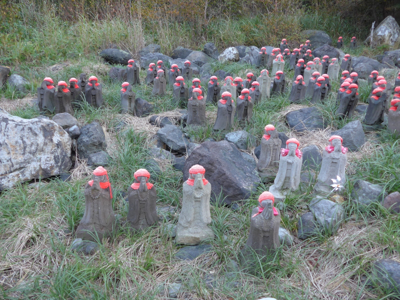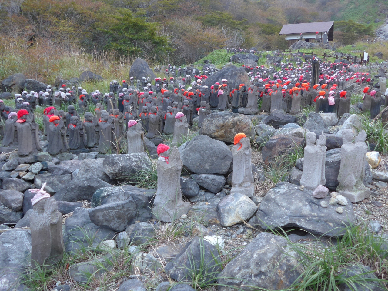 那須町湯本にある殺生石を見物に行く遊歩道の途中の左手に沢山の赤い帽子をかぶり両手を高く合わせたお地蔵様が異様なくらいに沢山並んでいます。
