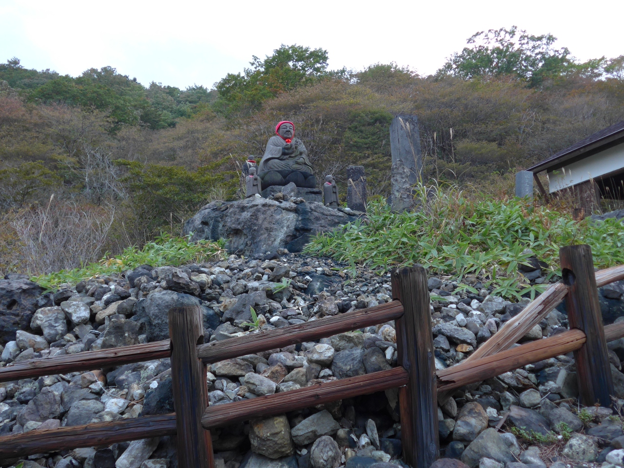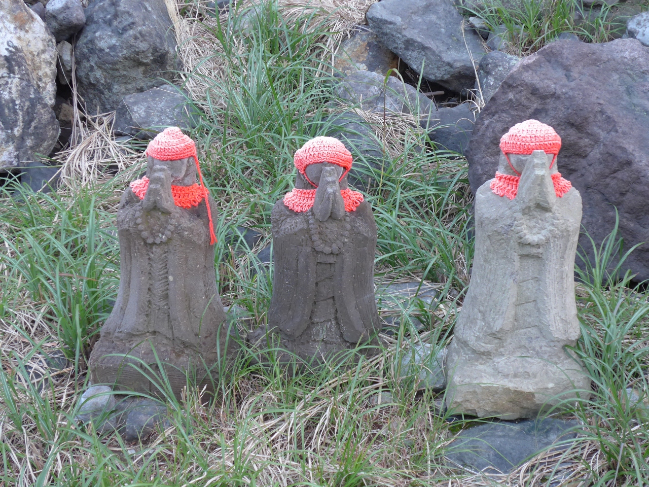 殺生石に行く手前に手を上に合わせた可愛いお地蔵様が沢山並んでいました!!