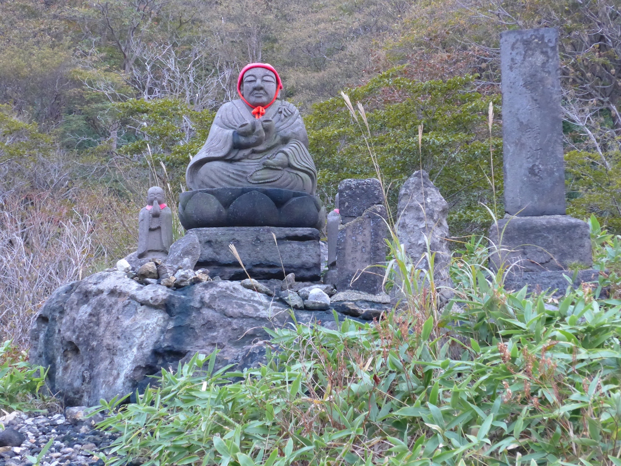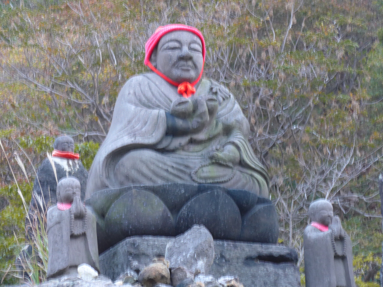 よく見かけるお地蔵様と違って合わせた手が高い位置にあるのと赤い帽子を被っていて