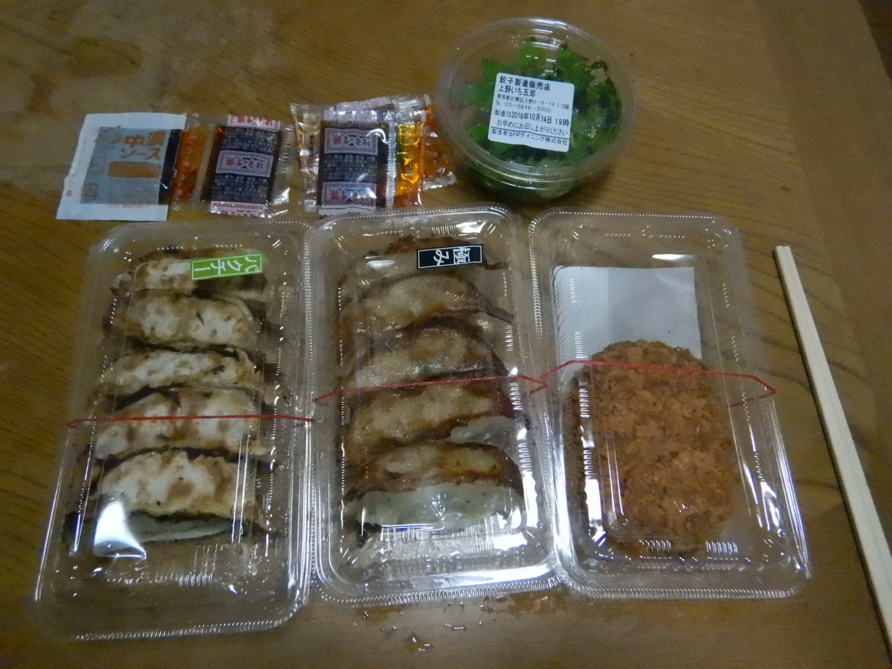 クリエイトレストランツ・ホールディングスの株主優待券が千円分ほどまだ余っているので、どこで使おうか考えた。上野まで行くのでここで餃子をテイクアウトするのが一番コスパがいいという結論に達した。「極み餃子」「パクチー餃子」「メンチカツ」をテイクアウト。計1070円。優待1000円分、現金の支払いは70円。